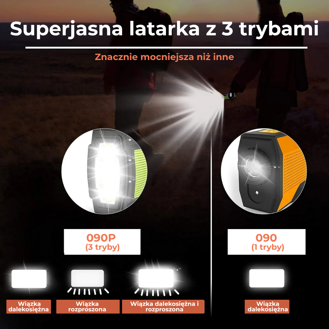 Tak, ma jasną latarkę z przodu i składane światło do czytania na górze – idealne do wnętrz lub namiotu.