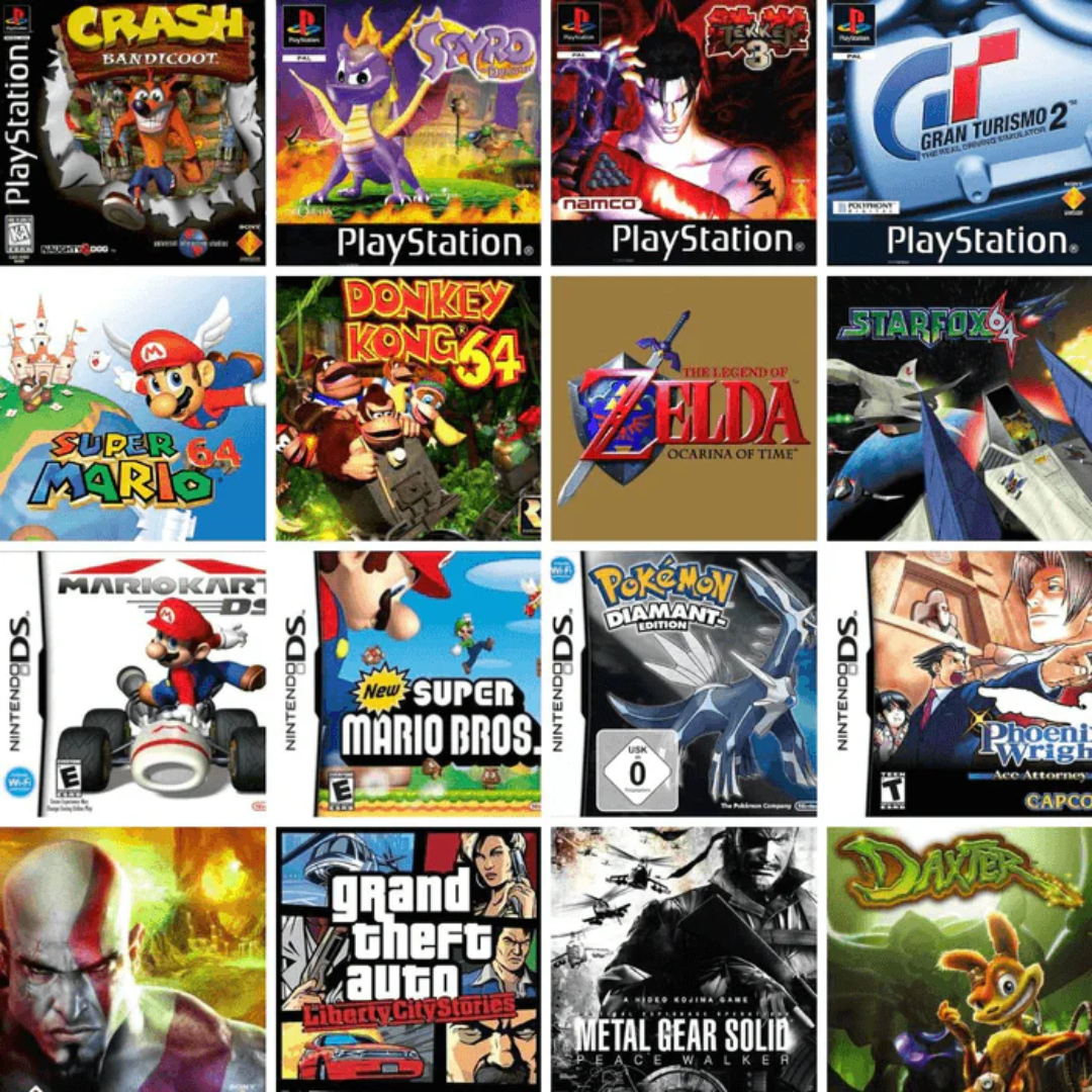 - Klasyki: Super Mario Bros, Donkey Kong, Sonic the Hedgehog, Pokémon Red/Blue/Yellow